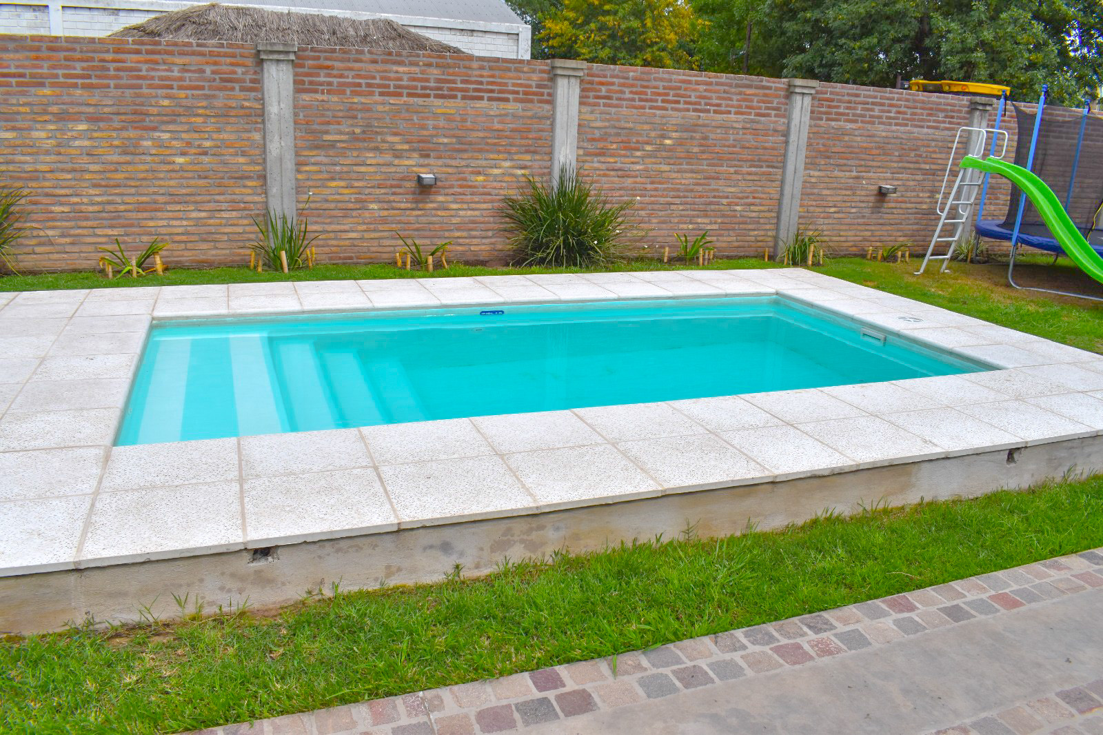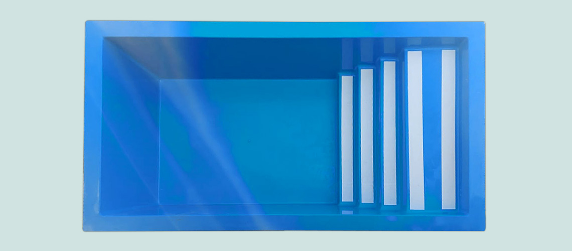 Su escalera rectangular permite un cómodo acceso a la piscina.