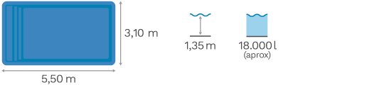 Dimensiones: 5.50 x 3.10 x 1.35 mts, solárium de 0,75 mts.