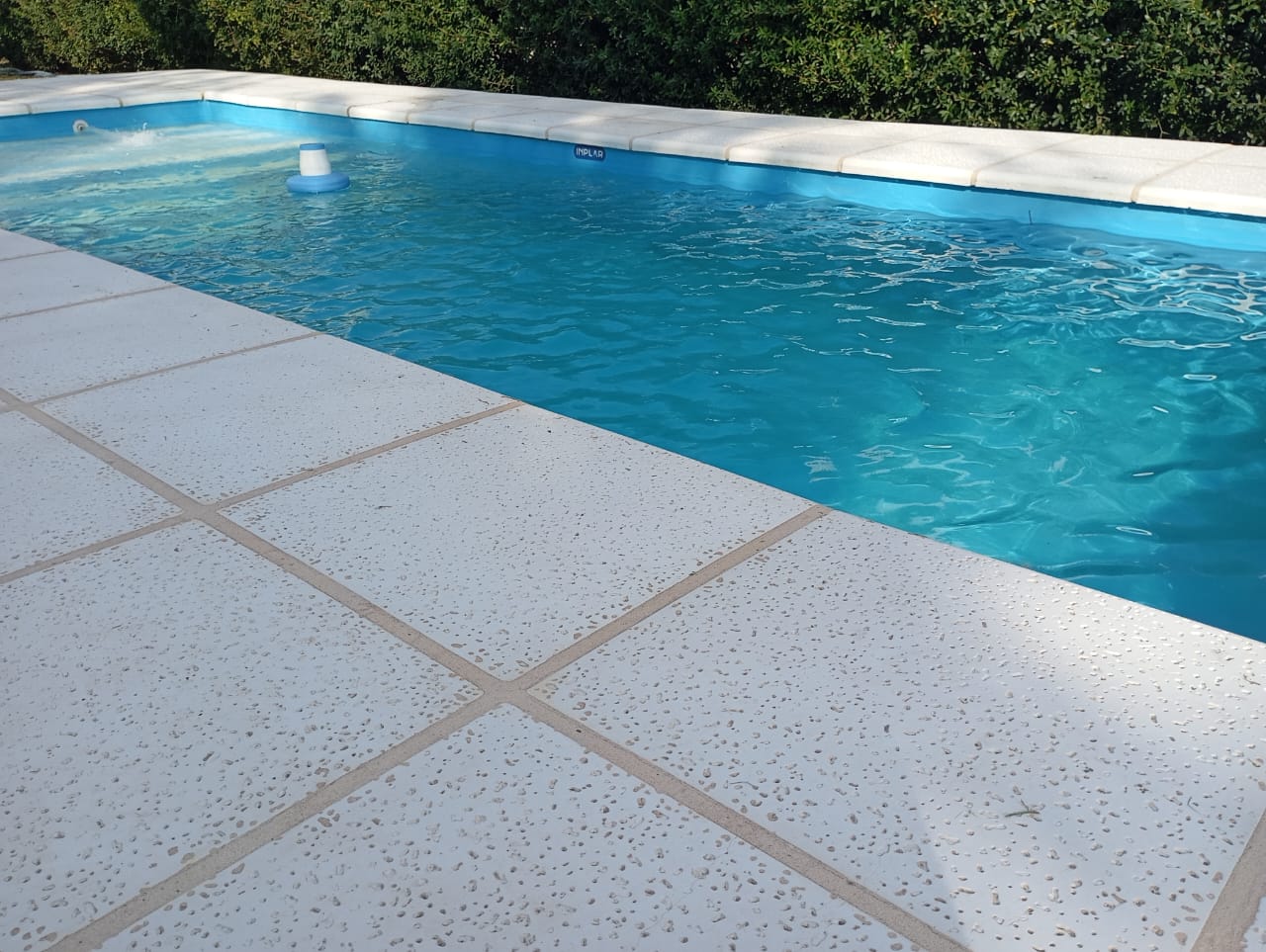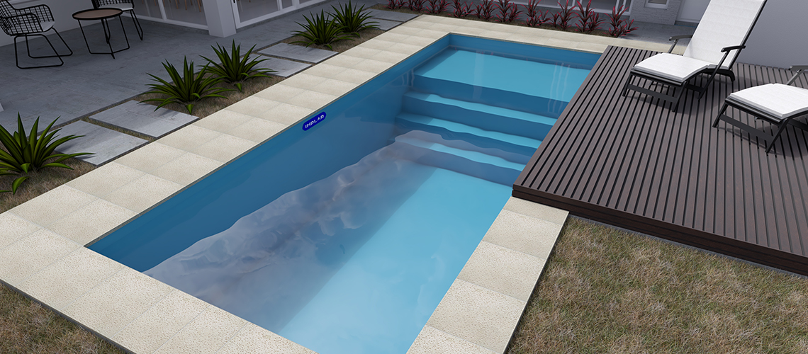 Su escalera rectangular permite un cómodo acceso a la piscina.