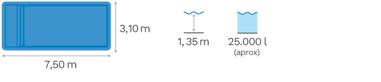 Dimensiones: 7.50 x 3.10 x 1.35 mts, solárium de 1,50 mts.
