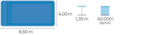 Dimensiones: 9.75 x 4.00 x 1.35 mts. (aprox.), solárium de 1.5 mts.