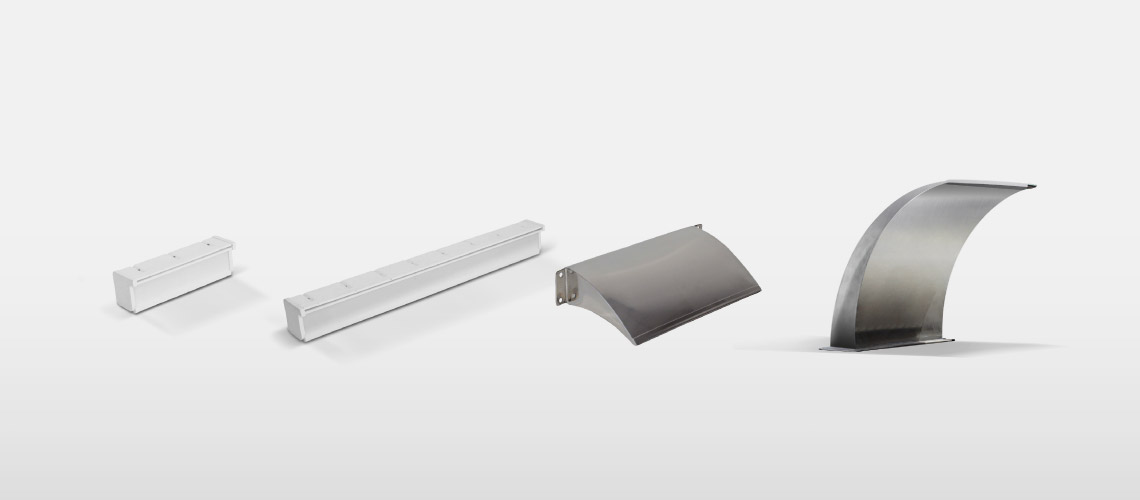 Cascada plástica o acero inoxidable ornamental, genera una lámina uniforme de agua, desde los labios de salida hasta el nivel del espejo de agua.