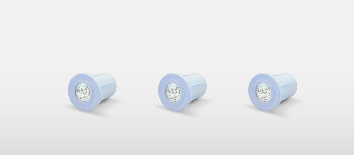Luminaria spot subacuática con aro blanco, para embutir en fibra de vidrio, con placa de 12 LEDs RGB de 3W, que opera con tensión de 12 V.